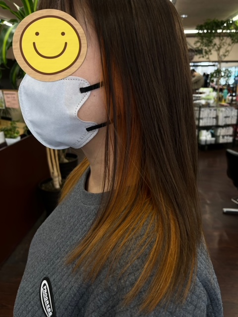 オレンジカラー 2023-02-14 葛塚店 mayo インナーカラーのお客様です! 前回は初めてのイヤリングカラーでさりげなく楽しみました✨ 今回は思い切って範囲を広げ可愛いオレンジを入れてみました🟠 良いですね👍✨ いつもと違う自分で楽しみましょう〜😊